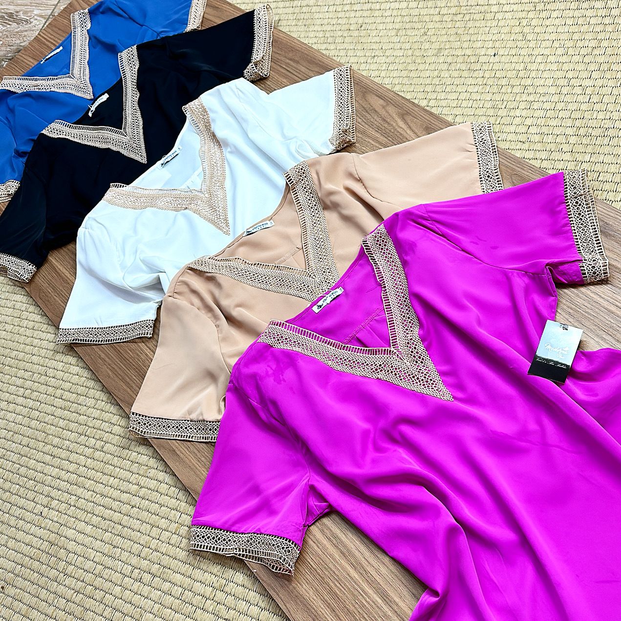BLUSA COM DETALHES EM RENDA NA GOLA E NA MANGA